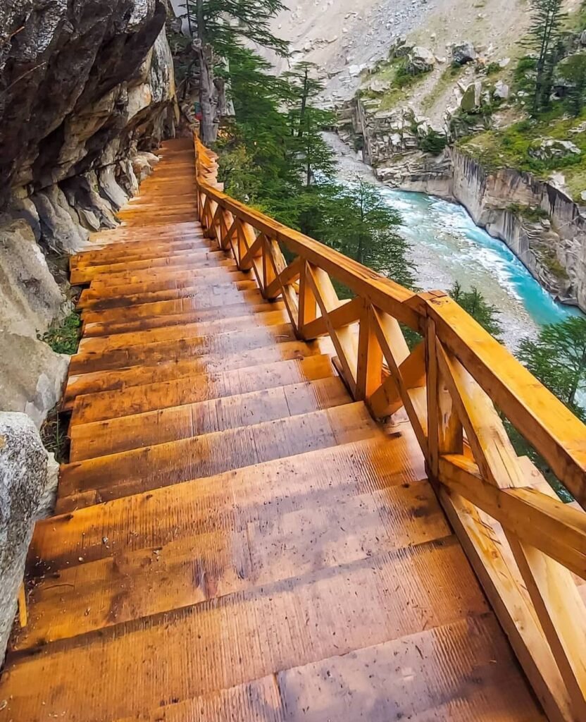 One of the most iconic features of the valley is Gartang Gali — a wooden walkway carved along a steep rock face.